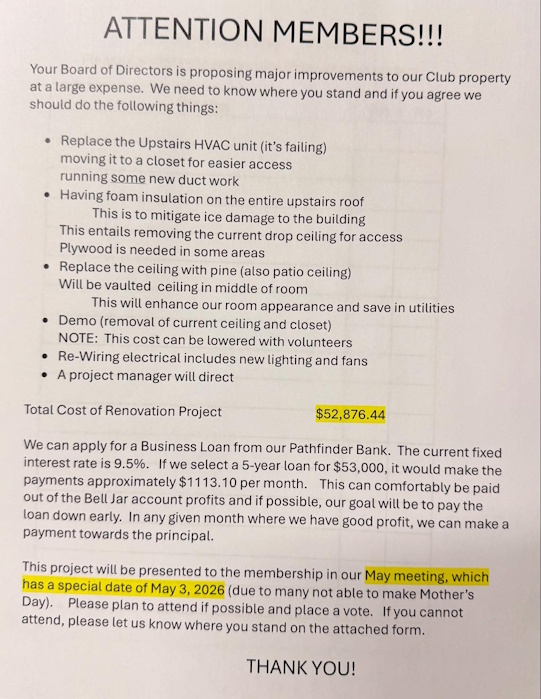 ATTENTION MEMBERS! Your Board of Directors is proposing a large project. Please read and give us your feedback Note that our May meeting is at a special day on Sunday, May 3 at 11 am. If you cannot make the meeting, you can comment on our Facebook page or there is also a form at the club on the bulletin board. See the proposal below:Please note our bar hours are: